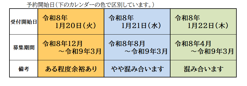 幼稚園・保育園(所)、小学校低・中・高学年、中学校の課程 午前/午後とも定員約60名です。