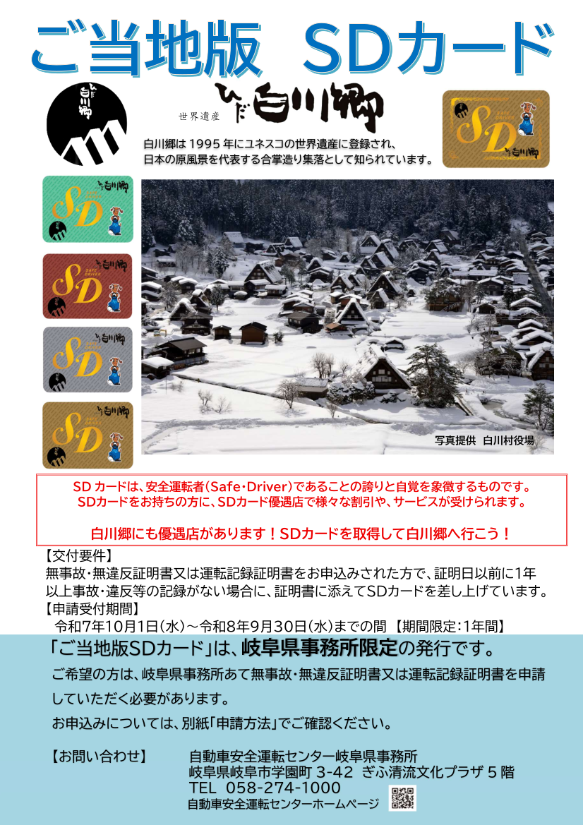 自動車安全運転センター岐阜県事務所では、岐阜県白川村の世界遺産「白川郷」のロゴマークが印刷された岐阜県事務所限定「ご当地版SDカード」を期間限定で交付します。