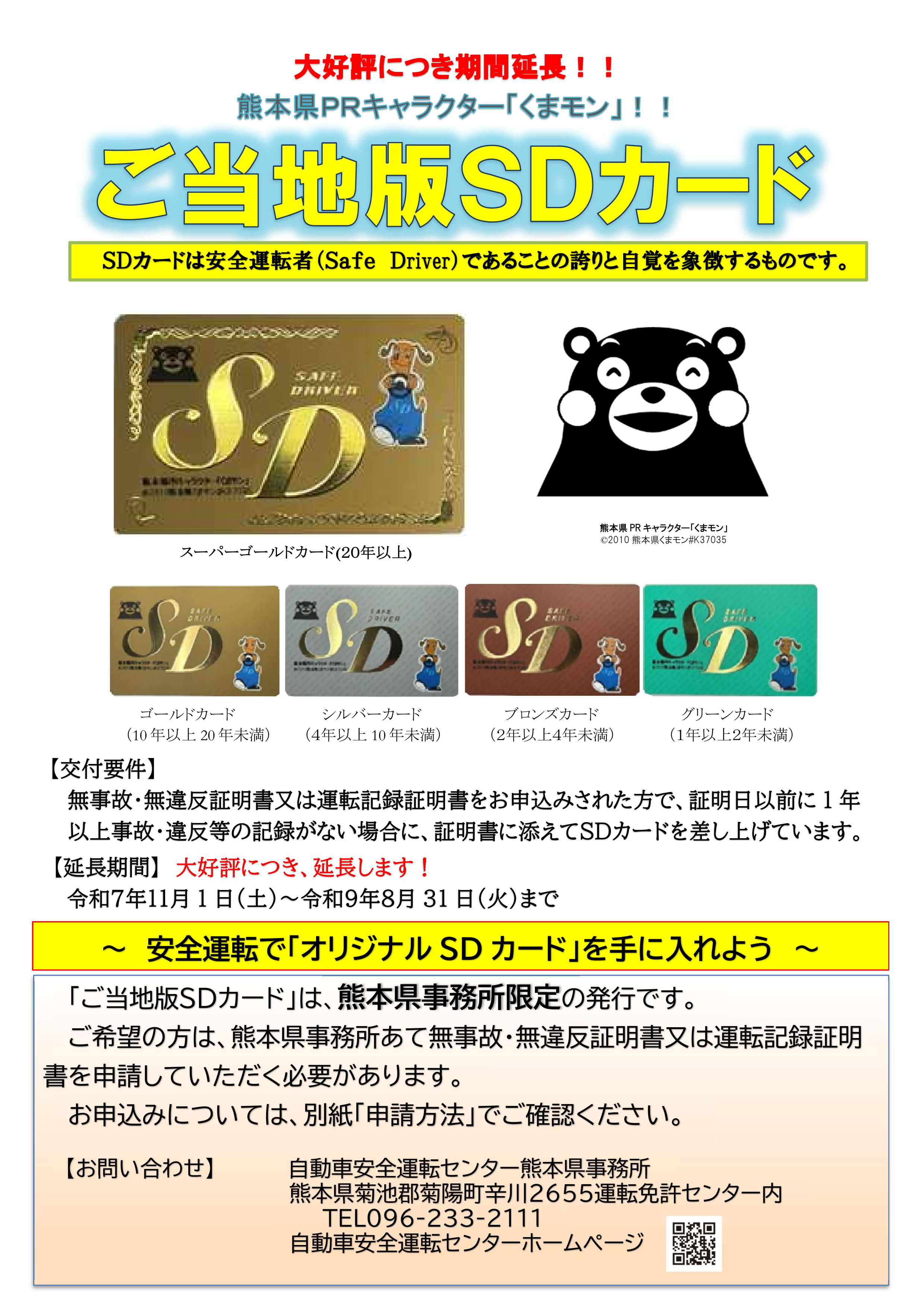 自動車安全運転センター熊本県事務所では、熊本県PRキャラクター「くまモン」が印刷された熊本県事務所限定「ご当地版SDカード」を交付しています。